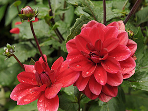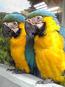 ルリコンゴウインコのカップル。梅雨時に綺麗な青でさわやか~。(雨宿り中)